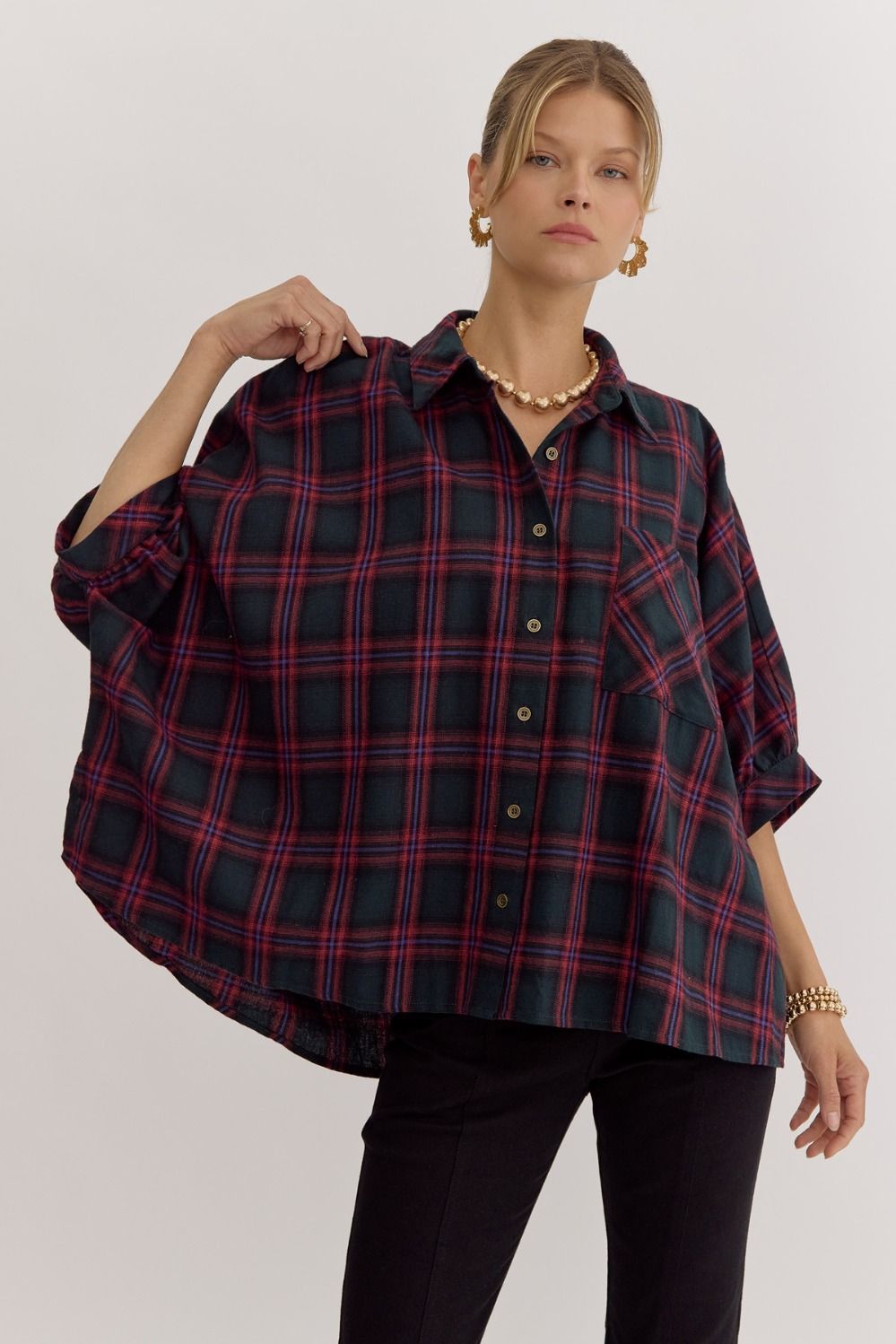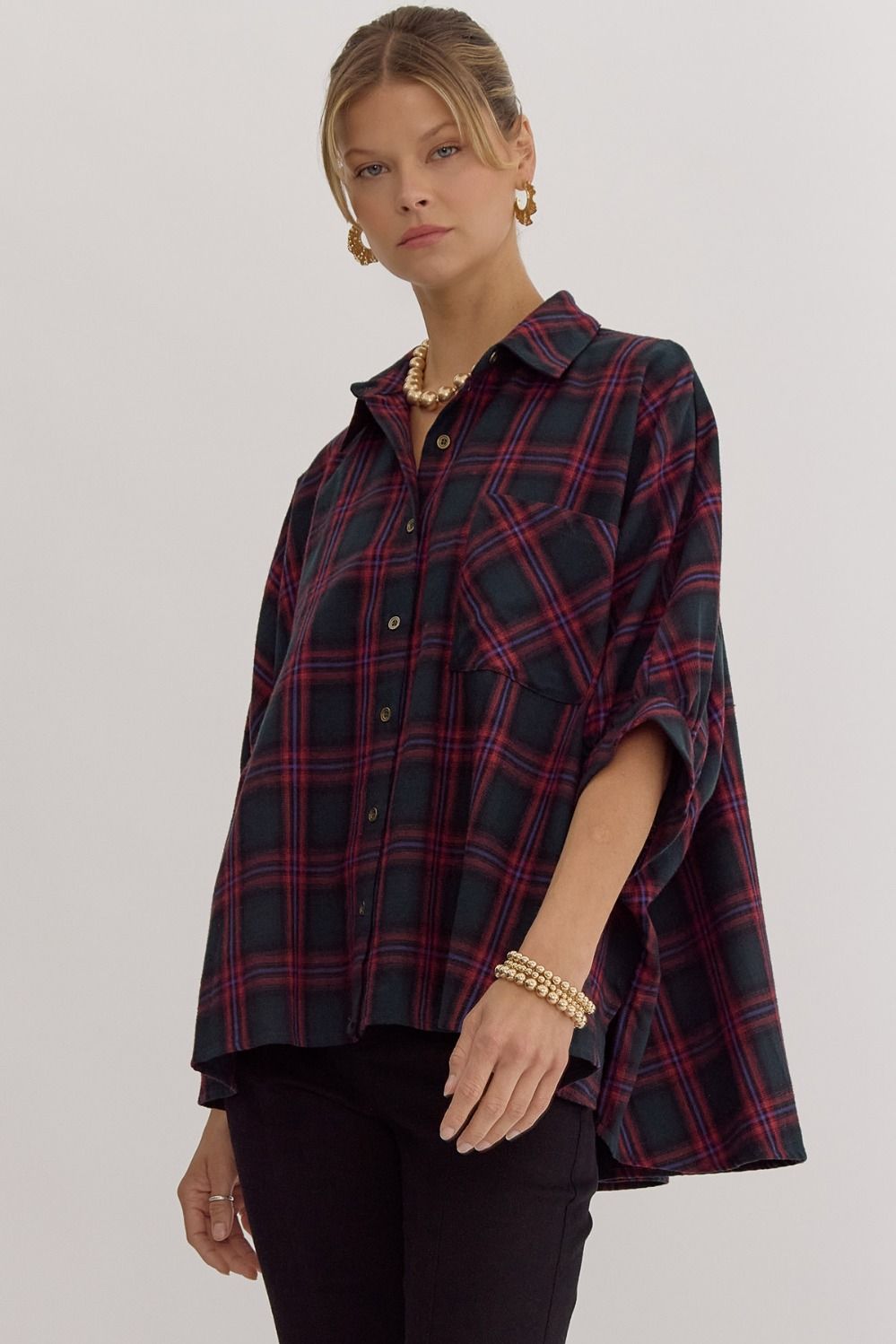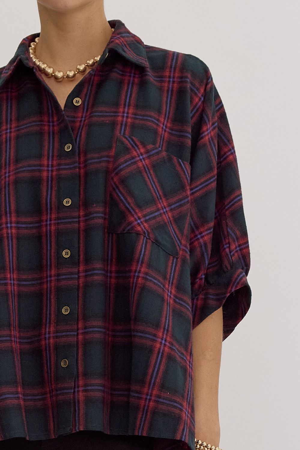 This oversized plaid button down top is a stylish and versatile addition to any wardrobe. The half sleeves and collared design add a touch of sophistication, while the pocket detail and side slits provide both functionality and style. Made from a lightweight and non-sheer woven material, this top is perfect for any occasion.