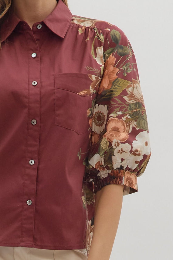 The Snapdragon Floral Top in Burgundy features a tailored cuff band and ¾ sleeves for a polished look. Crafted from lightweight woven fabric, it offers comfortable breathability without sheerness. The button-front collar adds classic detail, while the unlined design ensures ease of layering and all-day wearability. Ideal for those seeking a refined yet effortless floral print top.