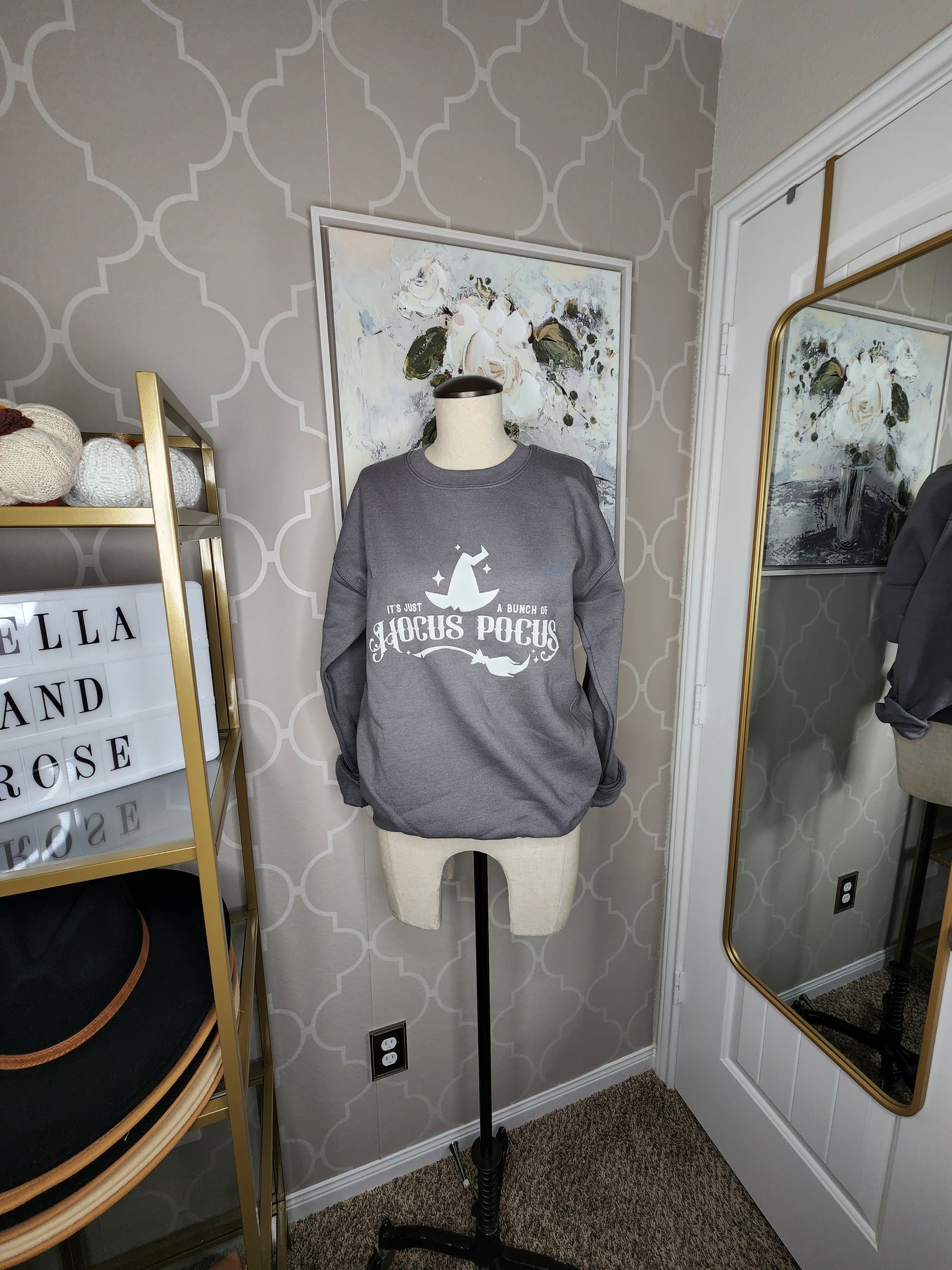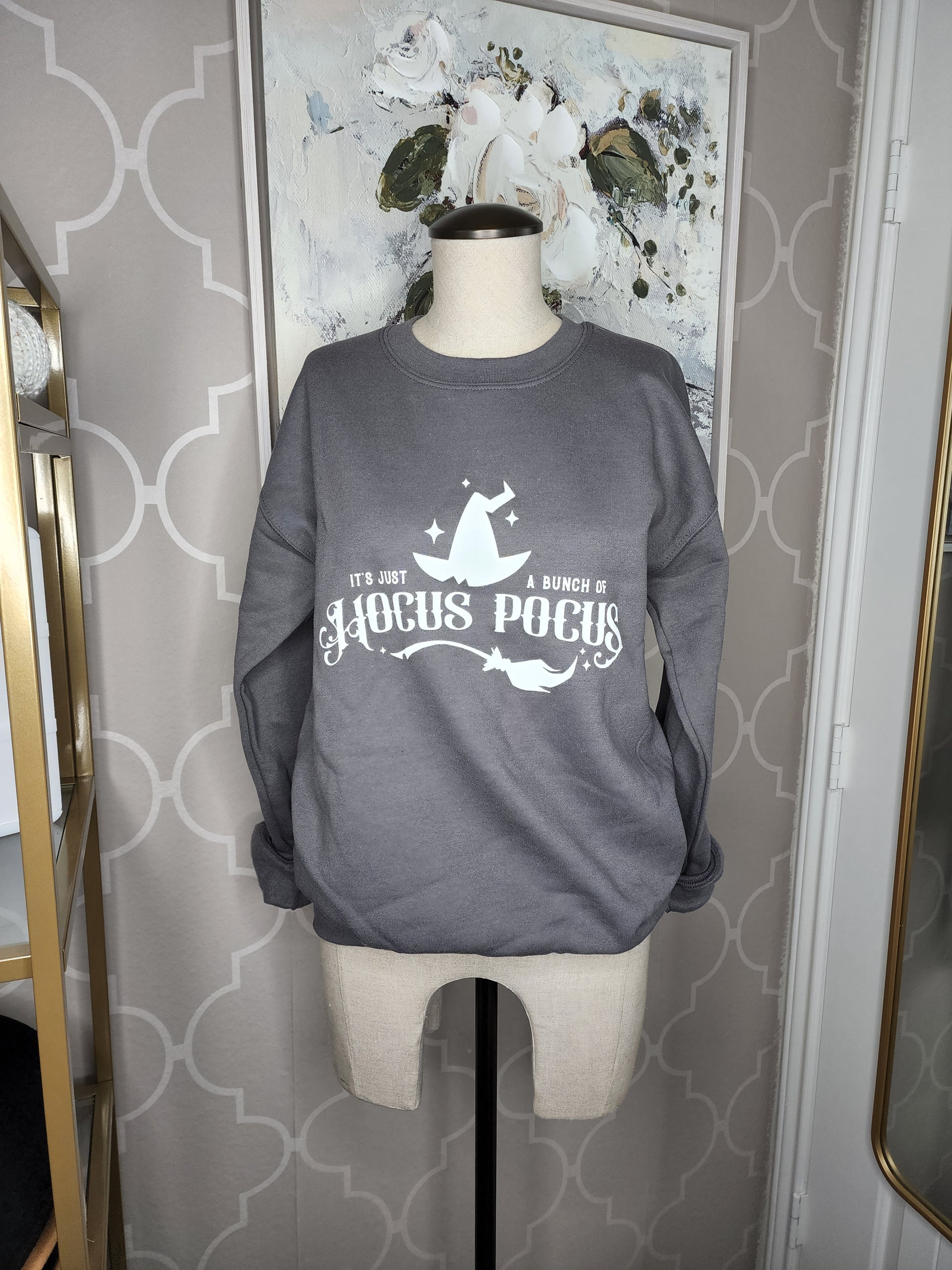Its all a bunch of Hocus Pocus printed on hunter green sweatshirt.