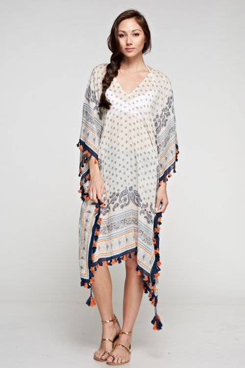 Border print paisley scarf printed caftan with multi color tassels and embroidery. One size.