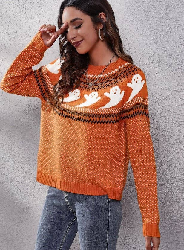This cute orange Halloween sweater features playful ghosts, making it perfect for the spooky season. Made with high-quality material, it offers both comfort and style. Embrace the spirit of Halloween with this adorable sweater.
