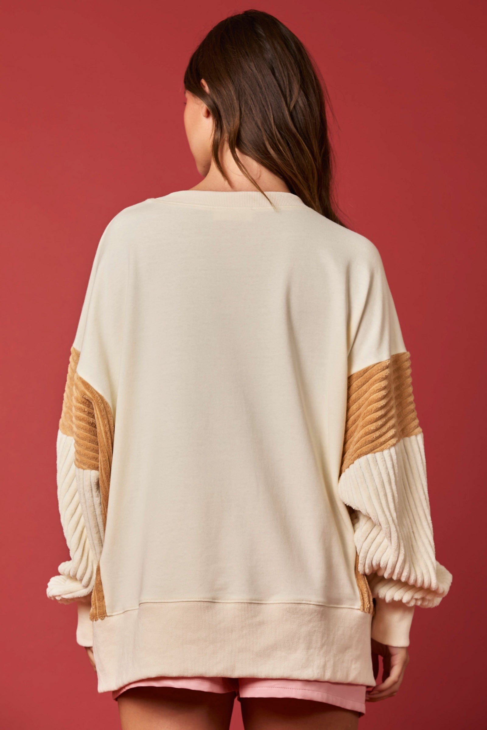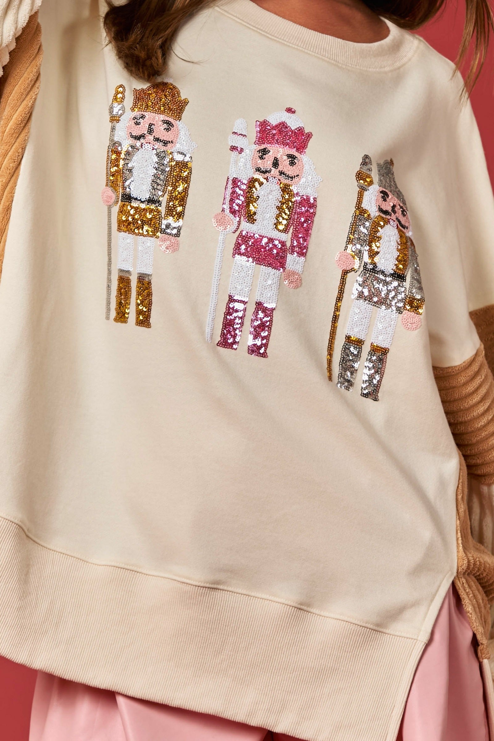 Experience the holidays in style with our Nutcracker Terry and Corduroy Sweater Cream. This cute mixed media sweater features sequin nutcrackers, adding a festive touch to your wardrobe. Made with terry fabric, enjoy the comfort and warmth of an oversized sweatshirt while looking effortlessly stylish. Perfect for any holiday occasion.