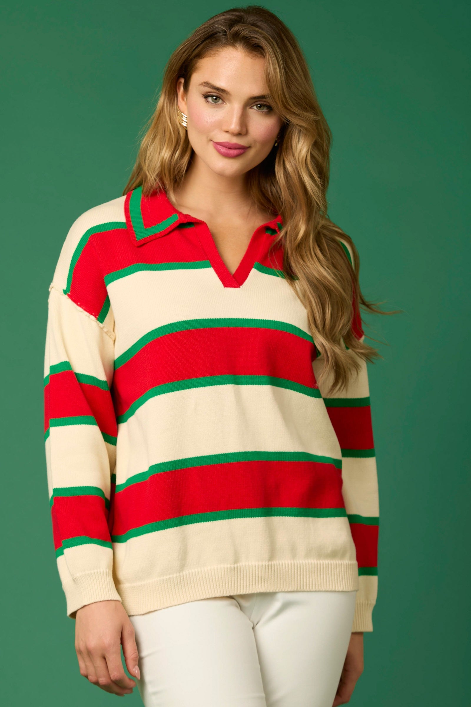 This Christmas Stripe Top is a casual pullover top that will add a touch of festive flair to your wardrobe. Made with cute, soft, and comfortable fabrics, it's perfect for holiday gatherings or cozy nights in. Enjoy the classic Christmas stripe colors while staying stylish and comfortable all season long.