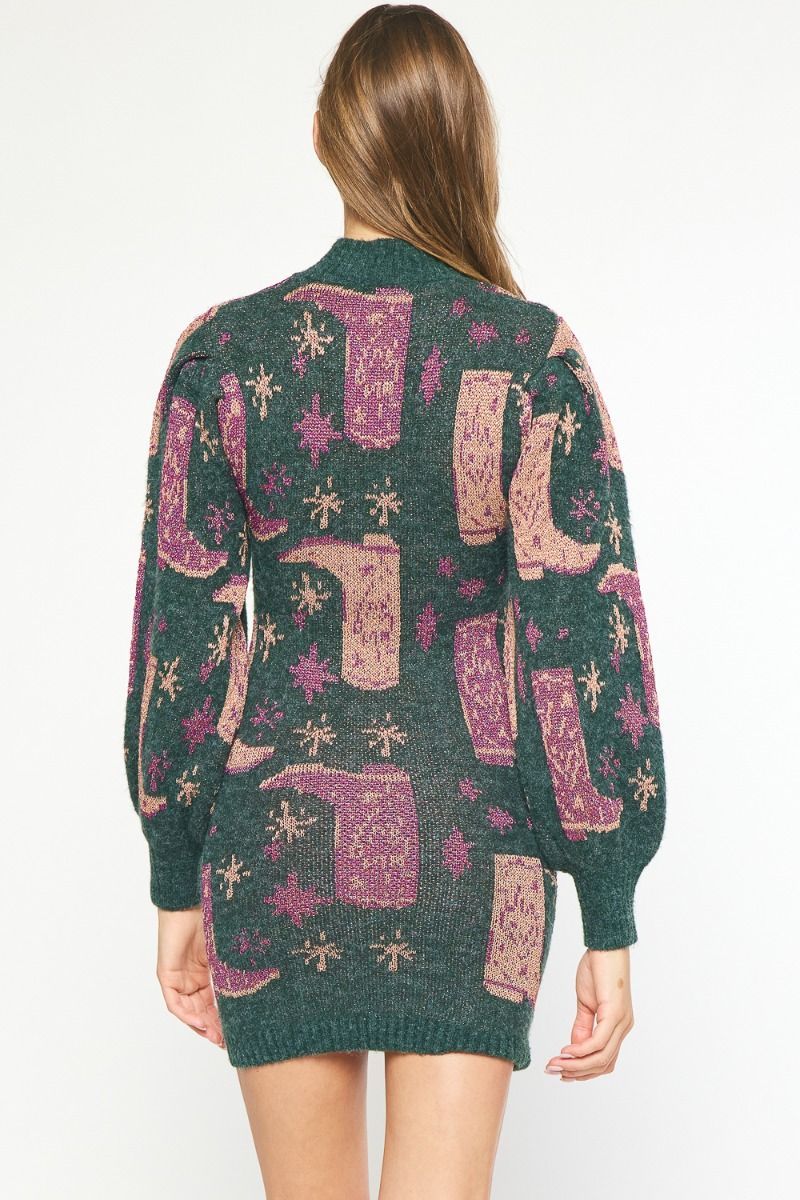 This Rhinestone Cowgirl Dress Green is a stylish and unique item. It features a cowboy boot print long sleeve knit mini dress with ribbed detail and is unlined, knit, and lightweight. The rhinestone detail adds a special touch that is sure to turn heads.
