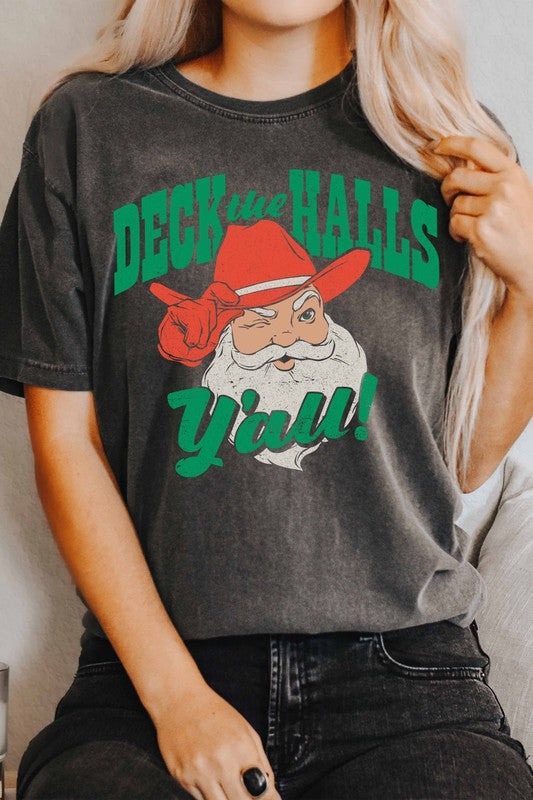 This premium cotton tee features a festive "Deck the Halls Ya'll" Western Santa graphic, perfect for spreading holiday cheer. Made from high-quality materials, it is both comfortable and durable. Celebrate the season in style with this unique and playful design.