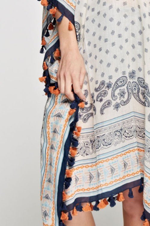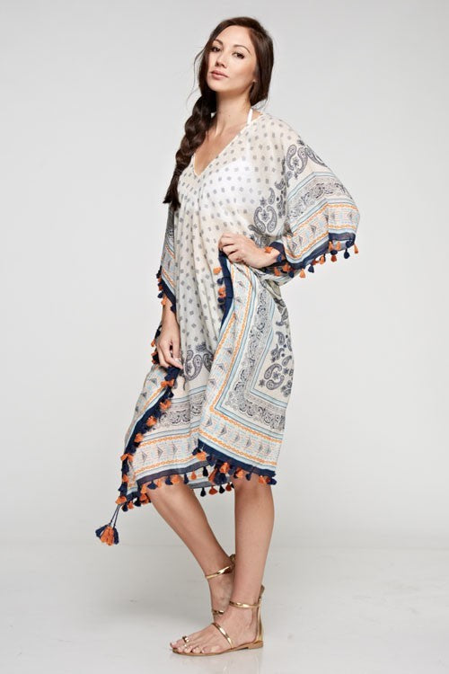Border print paisley scarf printed caftan with multi color tassels and embroidery. One size.