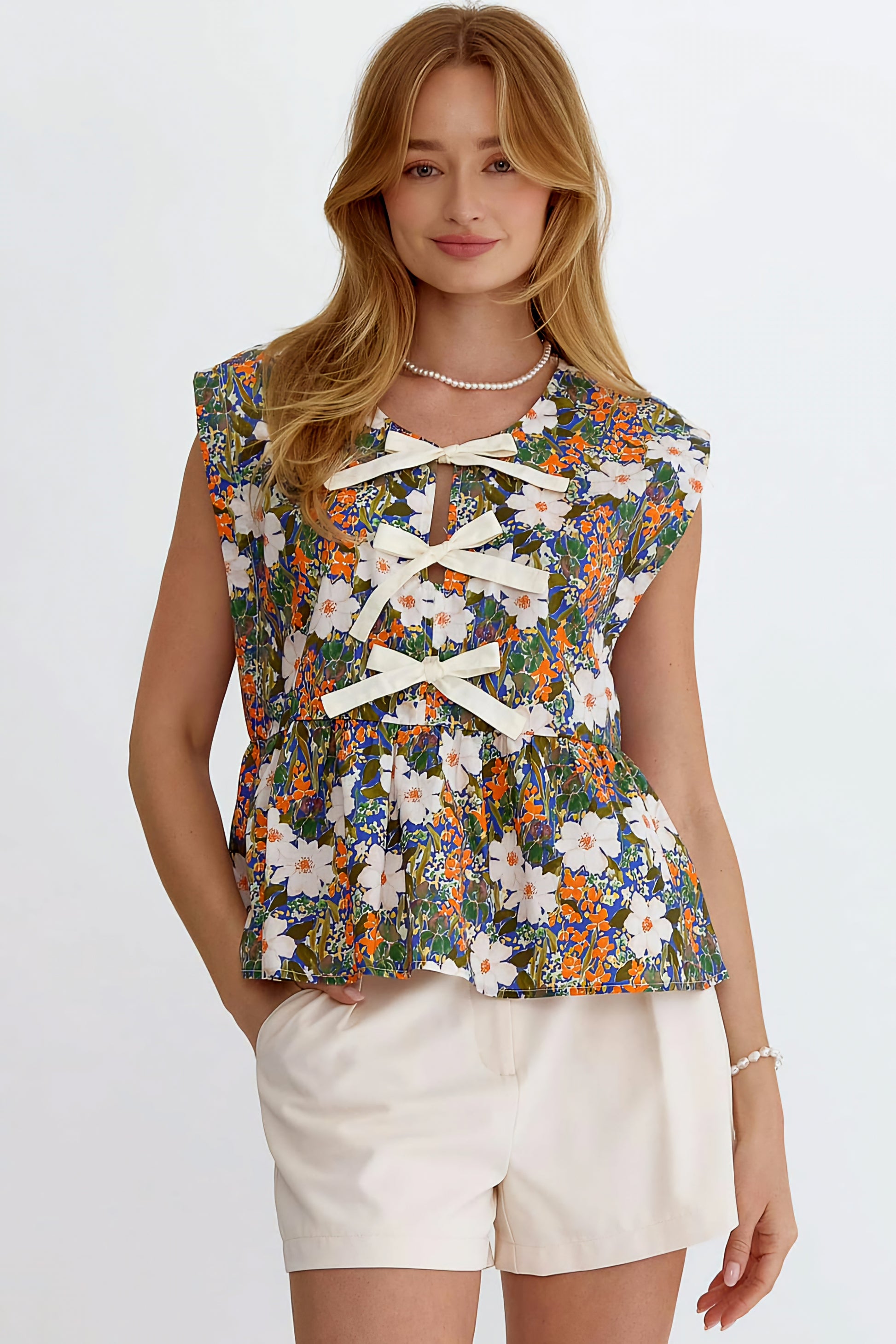 "Effortlessly achieve a charming and feminine look with our Flower Fields Bow Top. The cute peplum design is accented with delicate bows on the front, adding a touch of playful charm. Perfect for any occasion, this top is a must-have addition to your wardrobe."