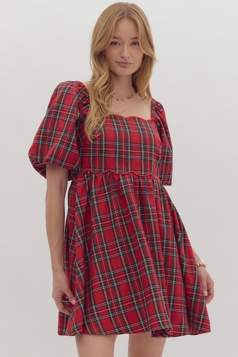 This festive holiday plaid dress is a must-have for any winter event. Featuring a classic plaid print, short puff sleeves, and a square neckline, this mini dress also includes convenient pockets and a smocked back for a comfortable yet stylish fit. The lightweight and non-sheer woven fabric is fully lined and features scalloped detailing for added charm. Perfect for dressing up or down, this dress is a versatile addition to any wardrobe.