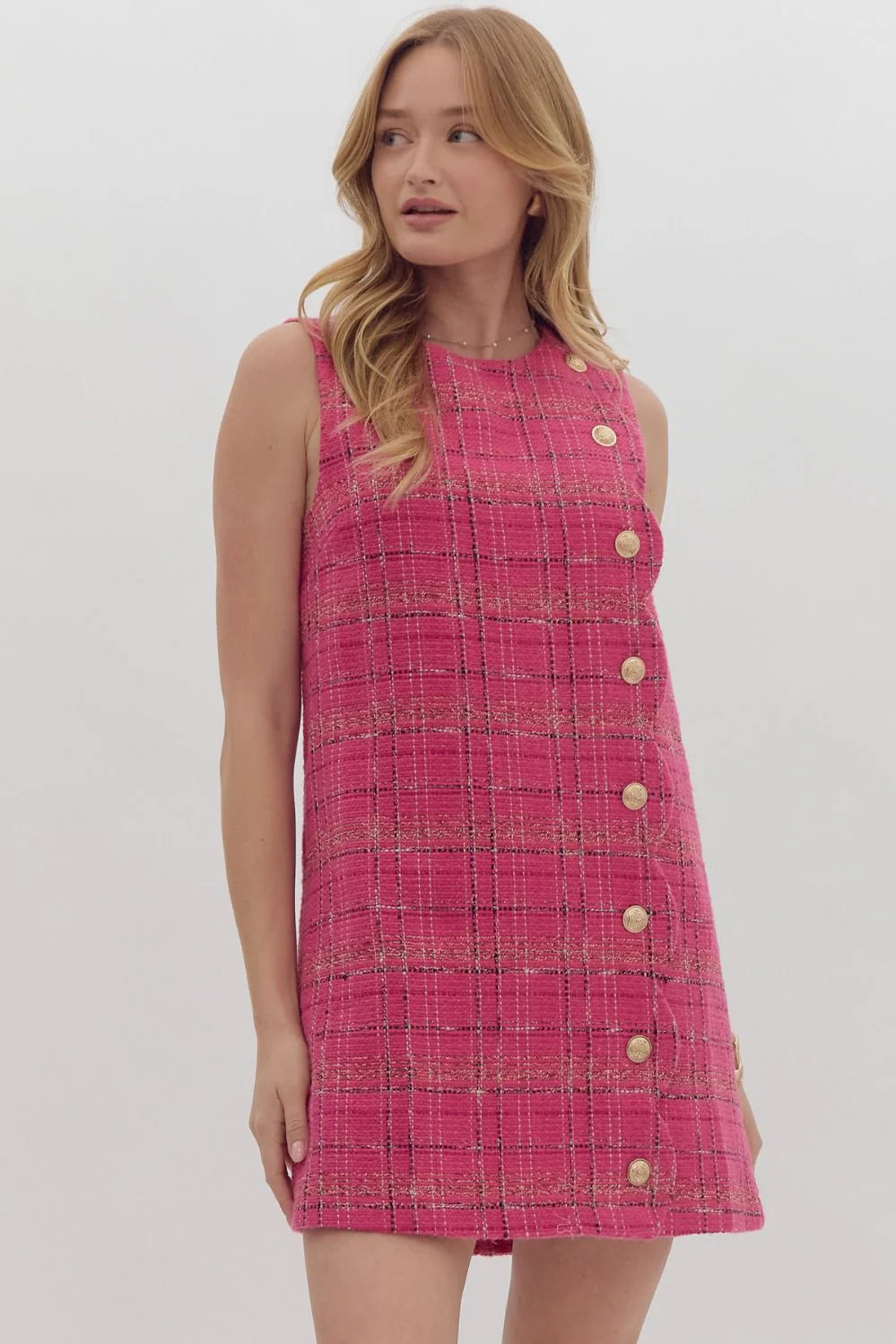 Expertly crafted from lightweight tweed, the Holiday Pink Tweed Dress is a sleeveless mini dress that exudes sophistication. The faux button up detail adds a touch of elegance, while the zipper closure ensures a perfect fit. Lined and non-sheer, this dress is perfect for any occasion.