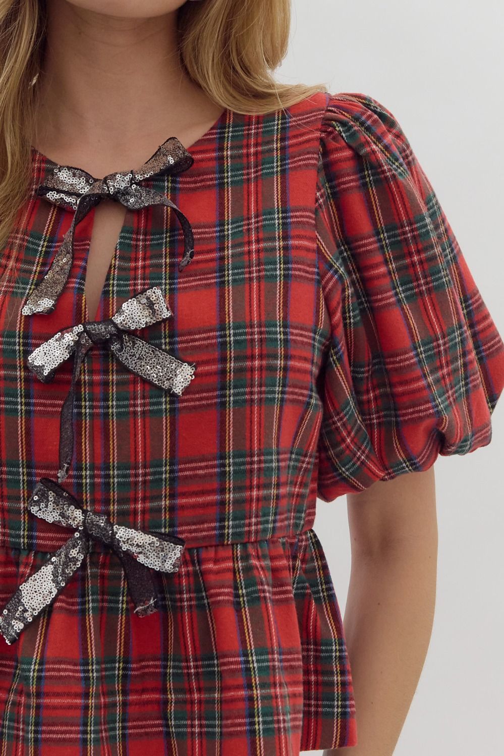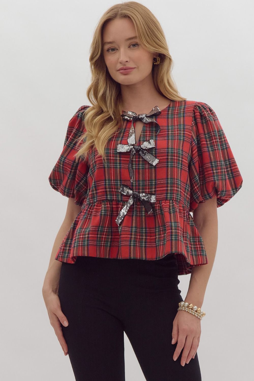 This plaid print top is perfect for the holiday season! Featuring cute short puff sleeves and a flattering peplum style, it also includes a sparkly sequin bow detail at the front. Lightweight and non-sheer, it's a stylish and comfortable choice for any festive occasion.