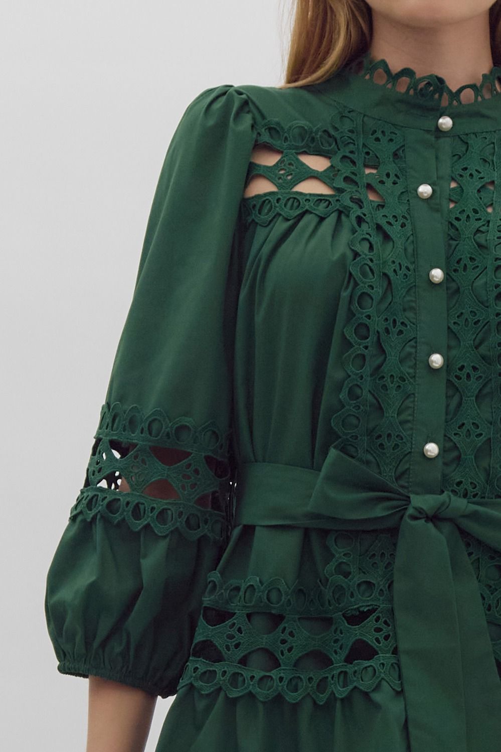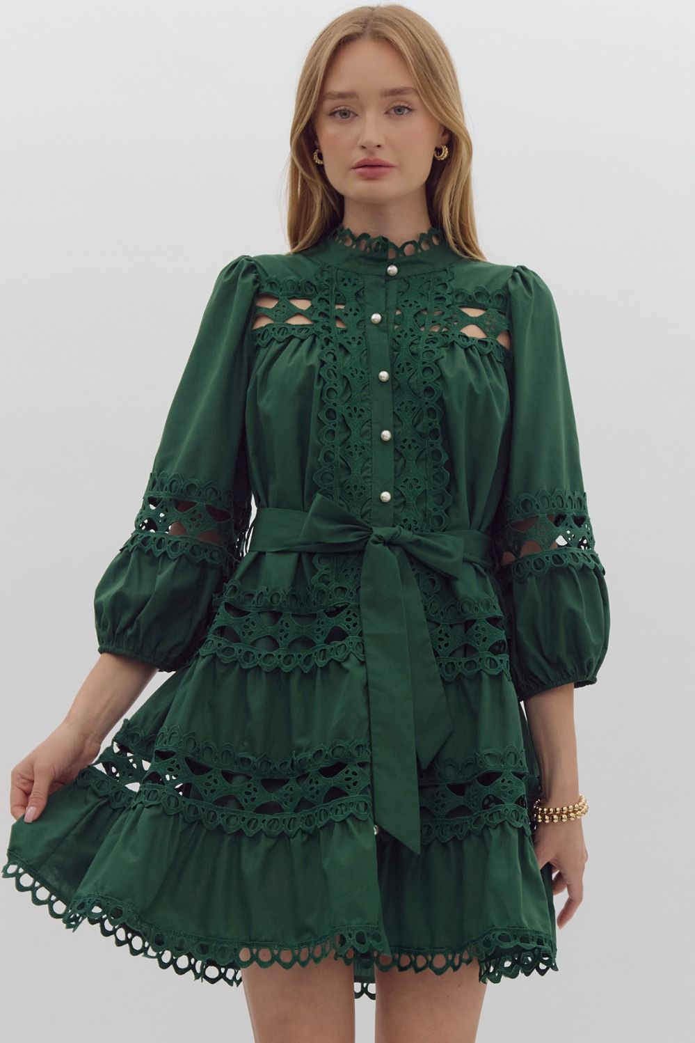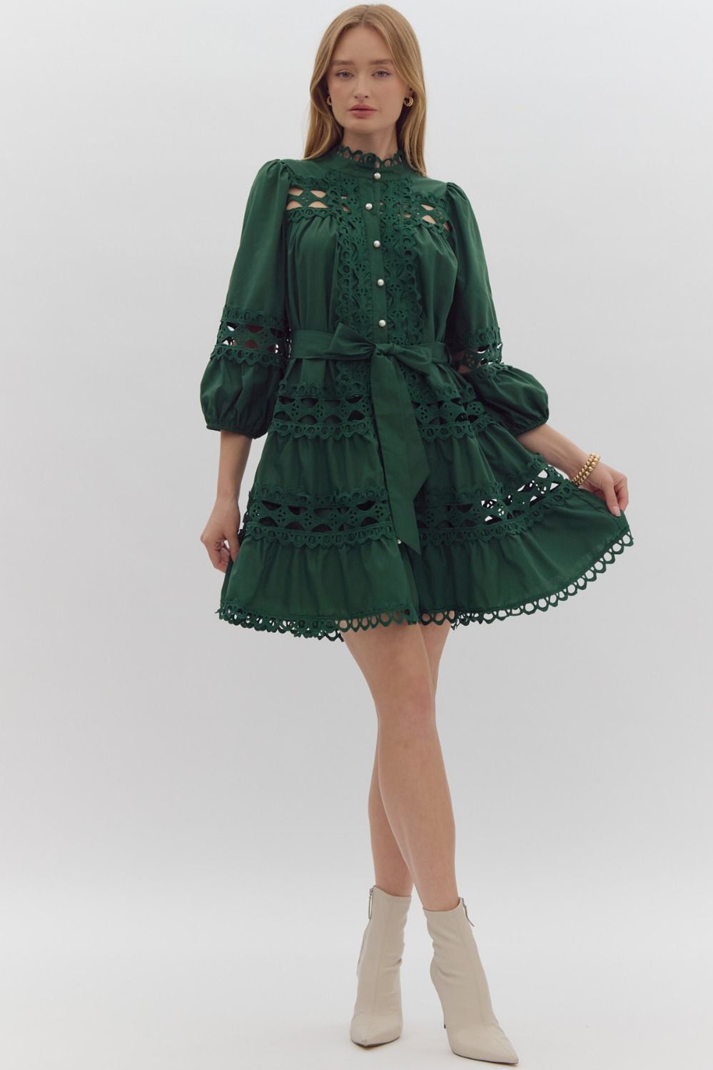 The Eliza Dress in Hunter Green is the perfect holiday outfit. Its gorgeous details will make you stand out at any event. A must-have for the season.