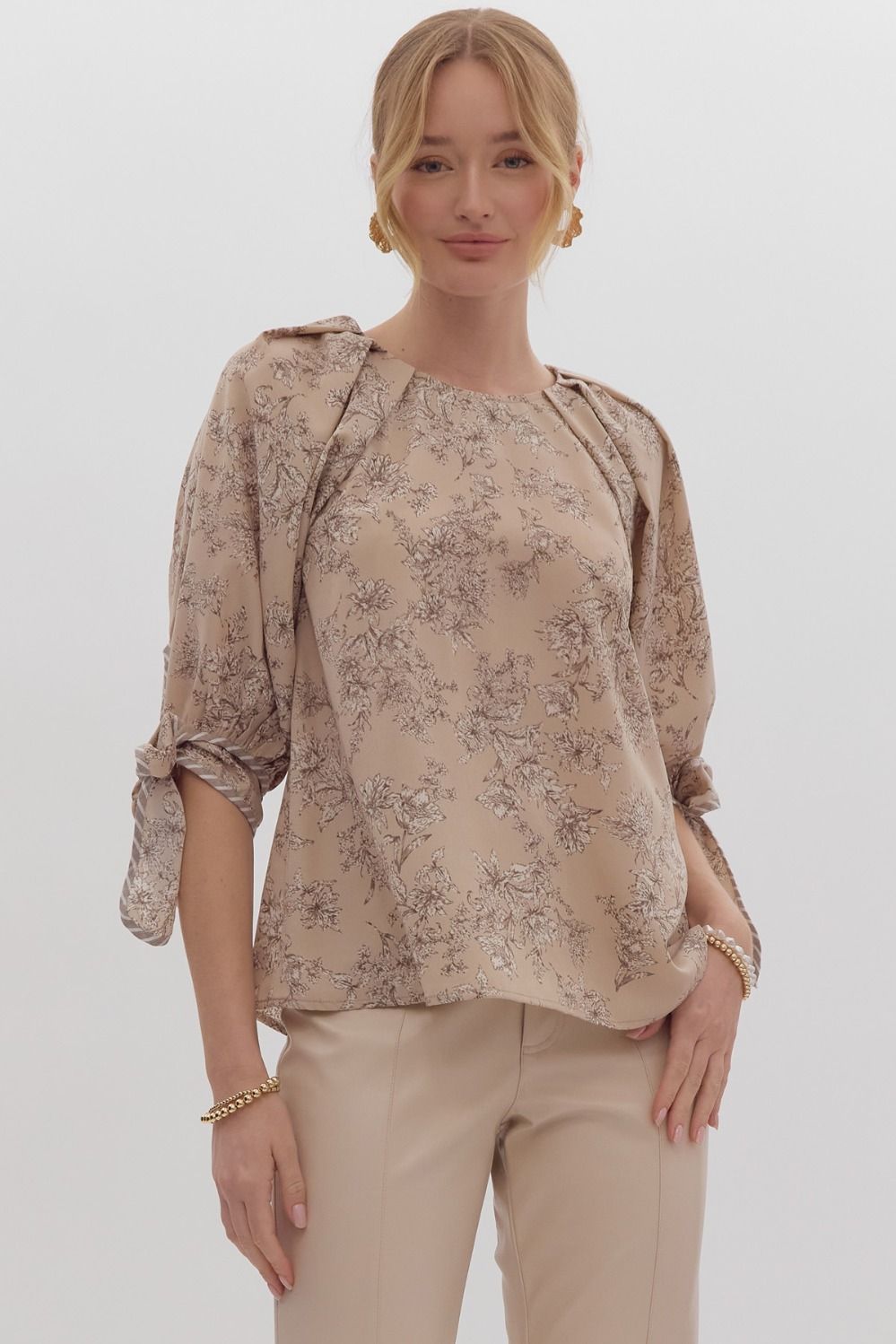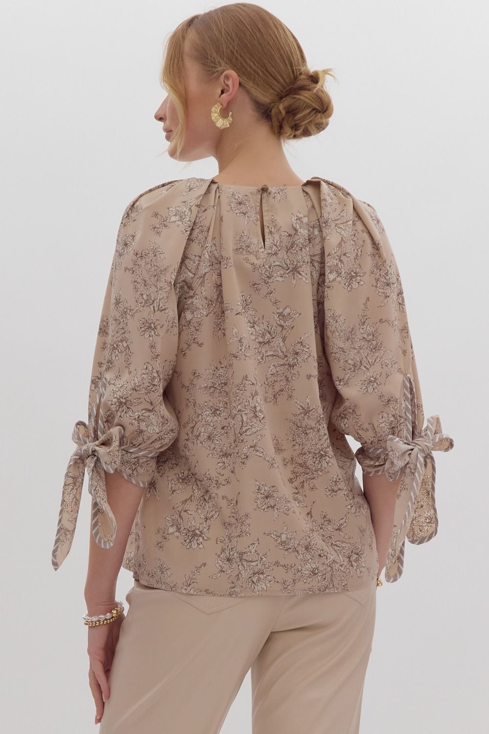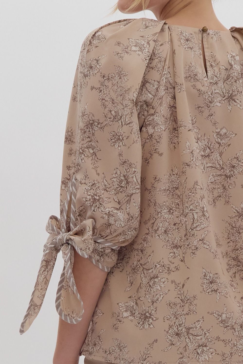 Timeless Toile Tie Sleeve Top Mocha